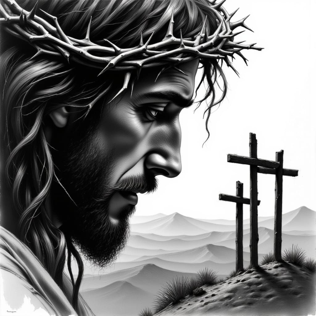 This image features a close-up profile of Jesus Christ, showing his face etched with sorrow under a crown of thorns. Rendered in a dramatic, high-contrast ink style, it emphasizes his sacrifice.