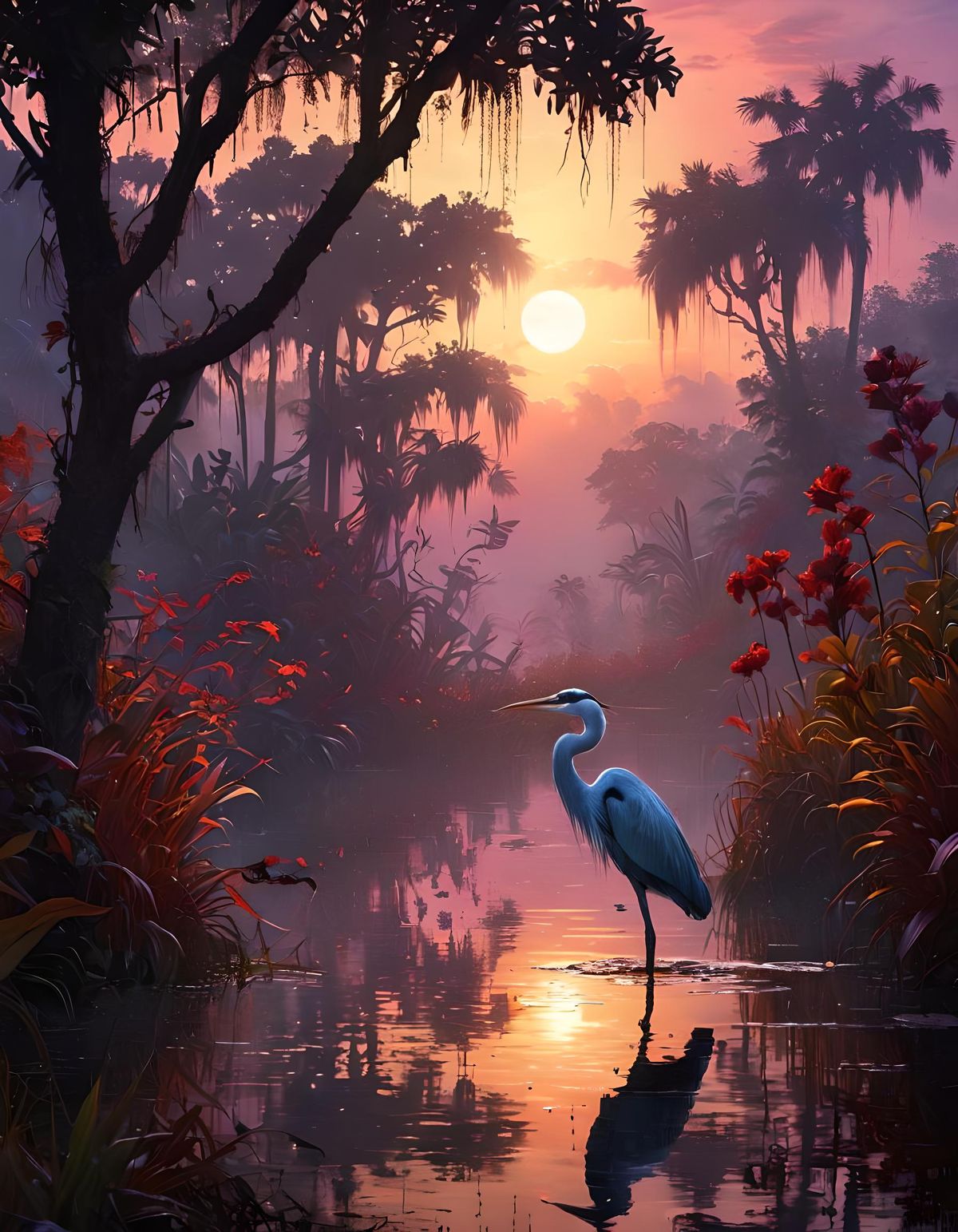 A beautiful fantasy landscape featuring neon flora and fauna in the Florida Everglades. The image has clear water reflections and ethereal mist, rendered as detailed matte painting with complementary colors.