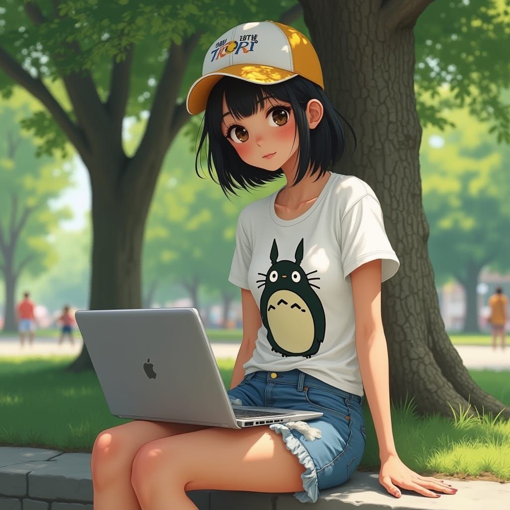 This image shows a young woman sitting under a tree in a park, surrounded by subtle textures and intricate details, reminiscent of hyper-realistic art styles.