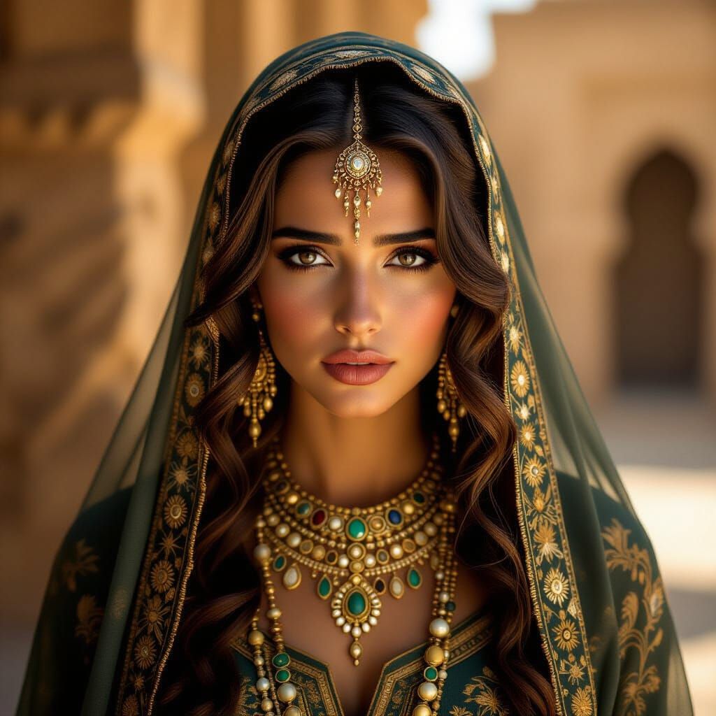 This image features a beautiful biblical woman with soulful brown eyes and a resilient expression, set against ancient architecture. It uses chiaroscuro lighting and warm earthy tones with cool blue accents.