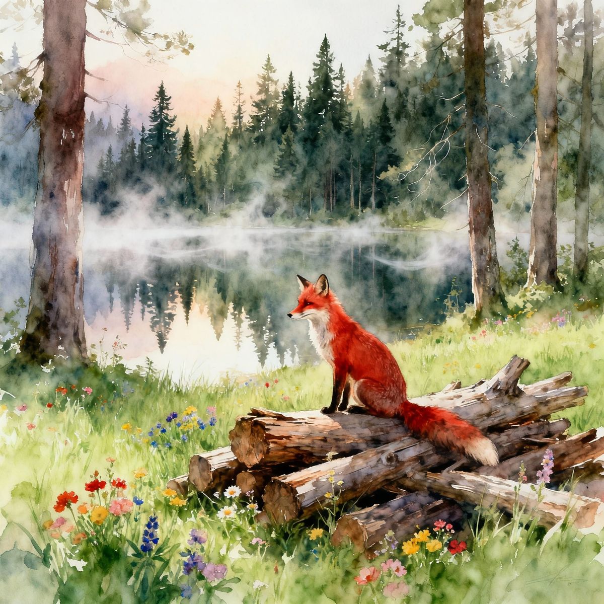 This image shows a graceful red fox resting on logs in a forest clearing with wildflowers. Rendered in a soft watercolour style, it evokes a peaceful, dreamlike morning scene with a tranquil lake.