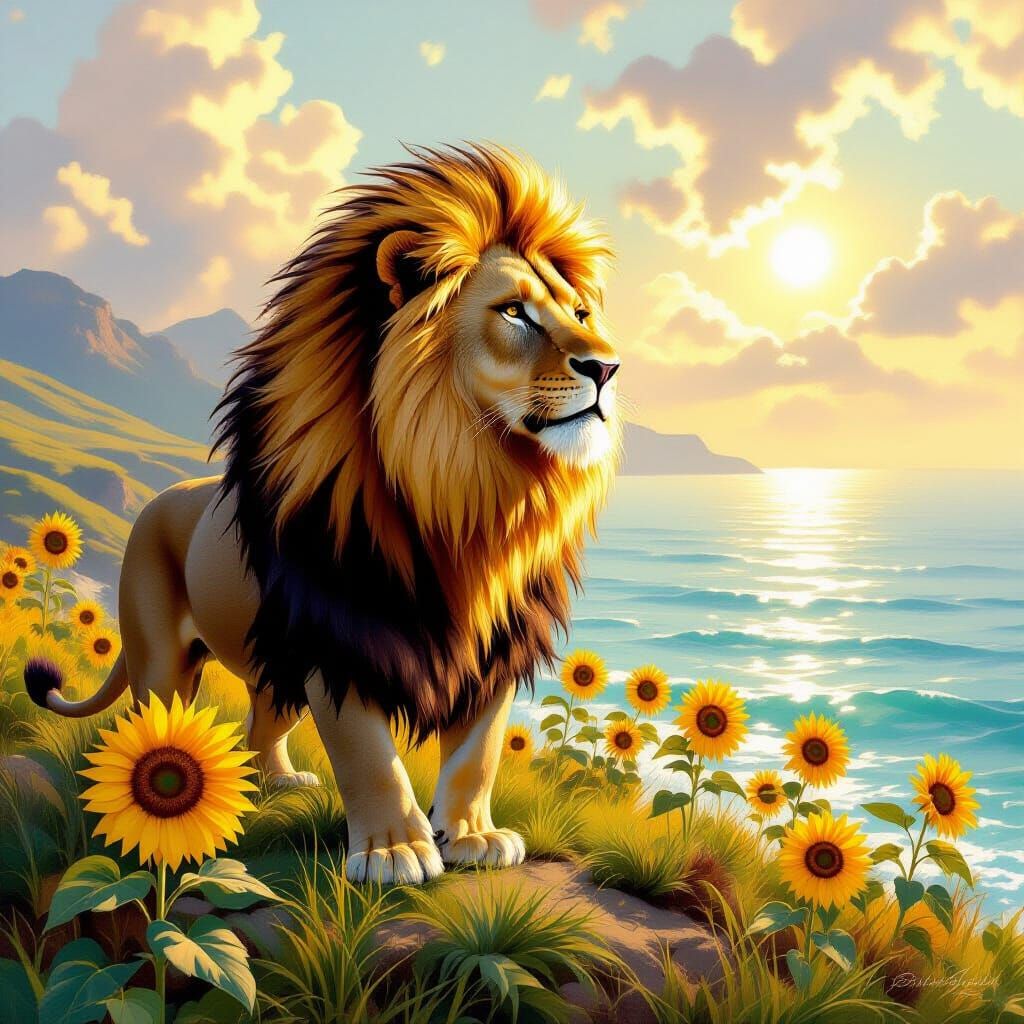 A striking picture of a golden lion with a sunflower mane standing on a hill and gazing at the sea. The image is bathed in warm light and rendered with hyperdetailed textures in an ethereal style.