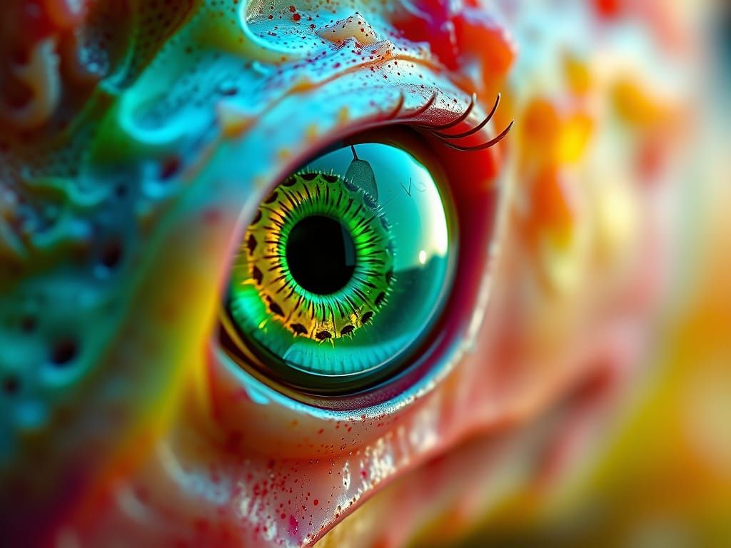 This captivating image showcases a seahorse's eyes in breathtaking, intricate detail, set against a vibrant rainbow green backdrop, as if from a maximalist digital painting.