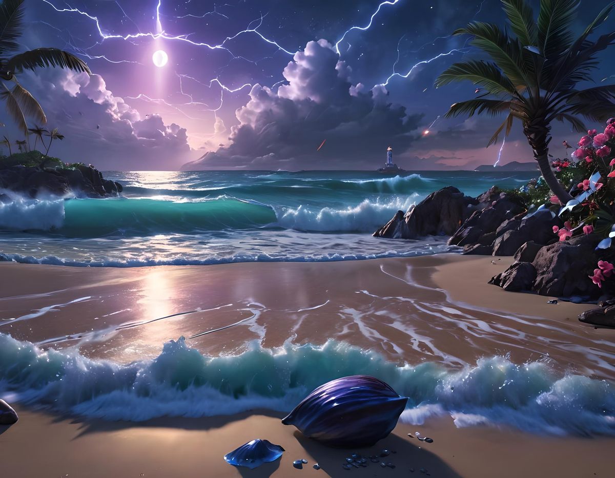 This image shows a vibrant beach scene under a moonlit sky, illuminated by blue lightning strikes. The composition includes waves, flowers, palm trees, seashells and a distant lighthouse in a hyperrealistic, splash art style.