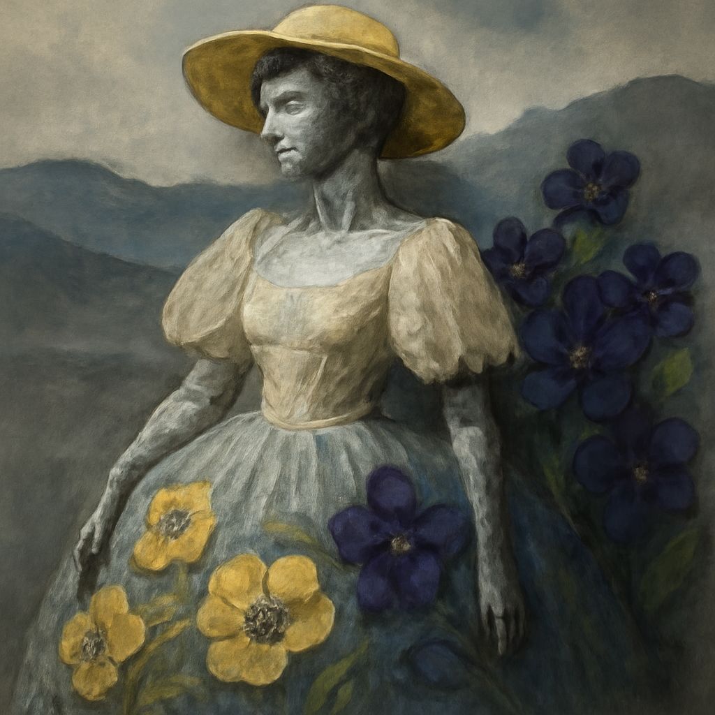 what a dream I had textile sculpture metallic paperic dressed in Aubrey Beardsley's organdie clothed in Caillebotte's crinoline of gilded lily underpansies artistically gratuitous violets darkly embodied ivory-greyblue hills softer than the rain's lyrical sculptural oomph depth of field atmospheric perspective ...