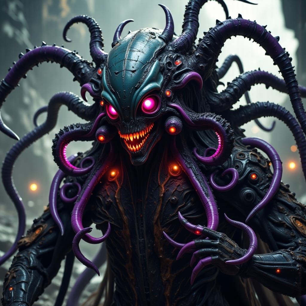 This image shows a menacing alien monster with glowing red eyes and purple, octopus-like arms. The creature wears tattered spaceship wreckage and evokes biomechanical horror with surreal, futuristic elements.