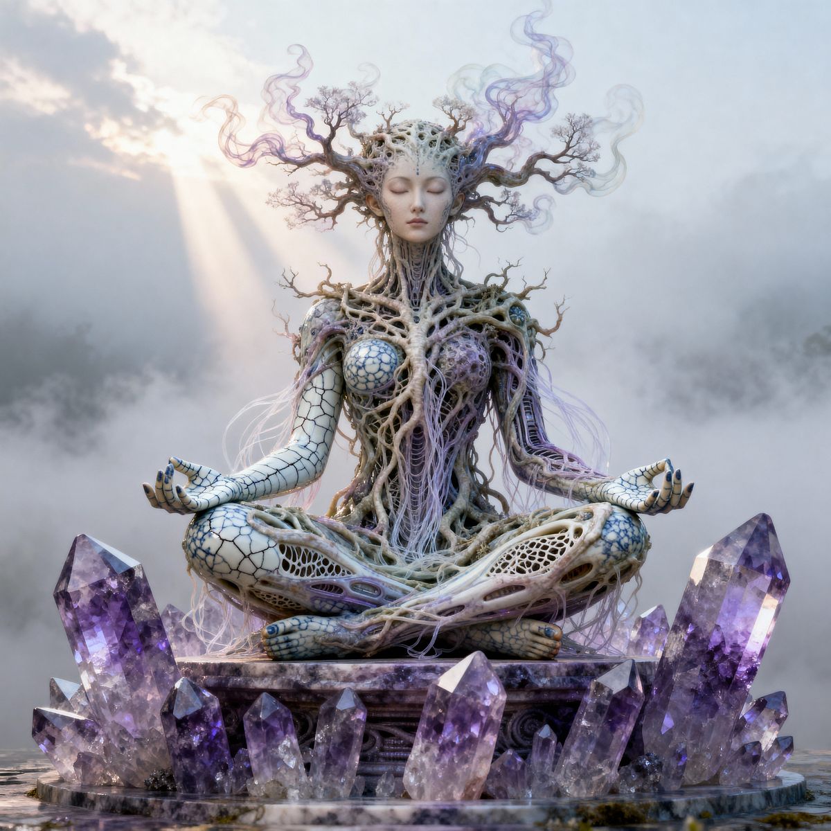 This image shows a serene figure of organic, root-like structures with vaporous tree shapes on her head, seated on a giant amethyst altar. Rendered in a biomechanical, biomorphic art style with pastel tones.