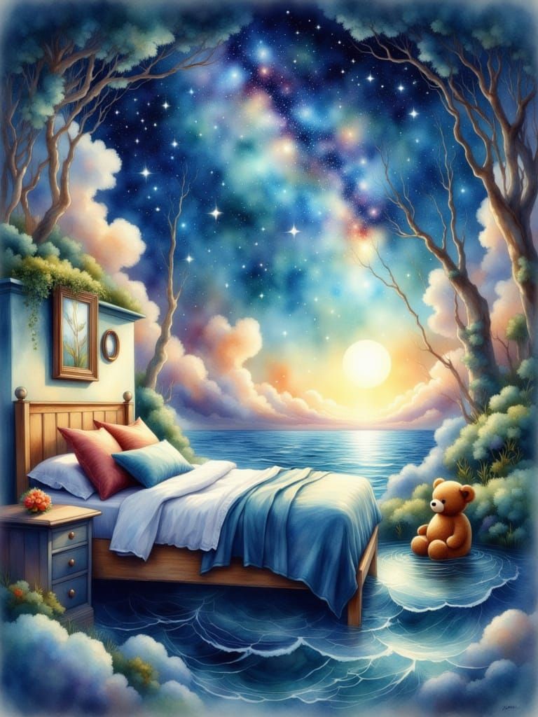 This surreal image shows a child's bedroom floating in a calm, starry ocean. A teddy bear sits by the window, bathed in warm light, creating a cozy, painterly scene.