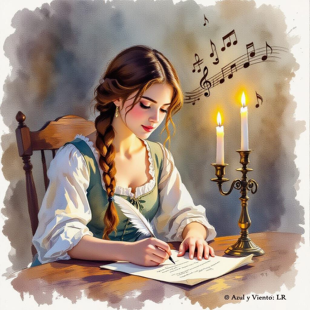This image captures a young woman with a braid writing on parchment by candlelight. Rendered in an expressive watercolor style with soft, bleeding colors, evoking a warm, ethereal atmosphere.
