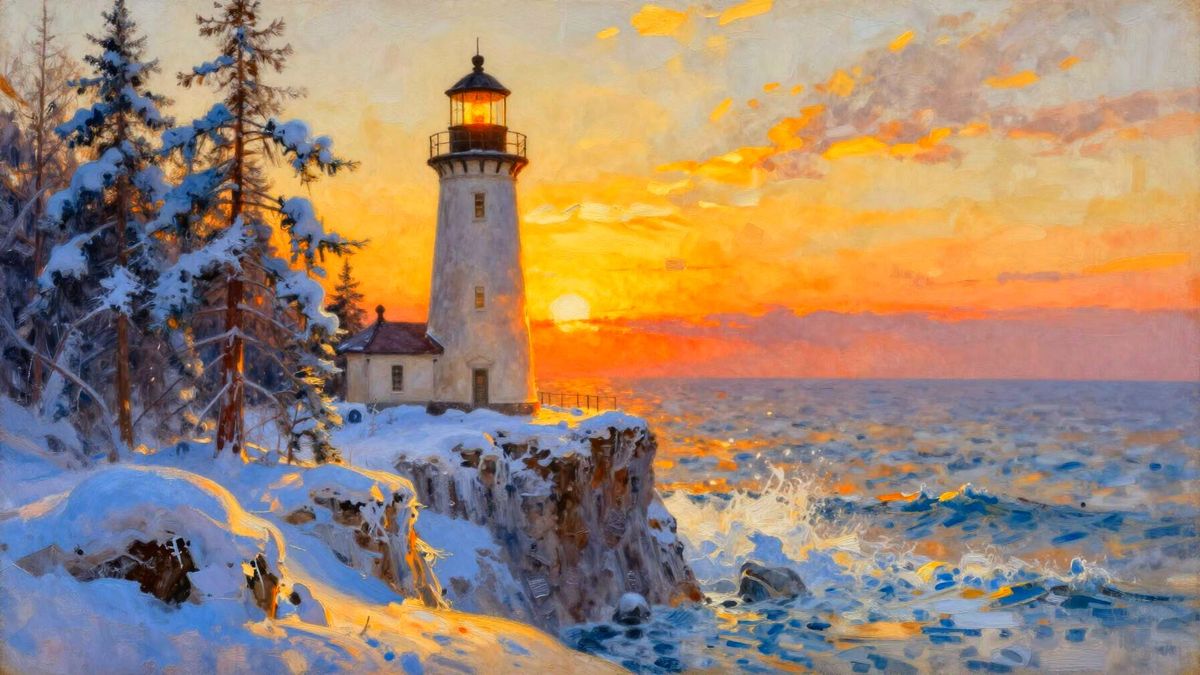 This image depicts a vintage lighthouse on an icy cliff during a golden hour sunset. Snow whips through the air, with a frozen forest framing the scene, rendered in a thick, textured gouache and watercolor style.