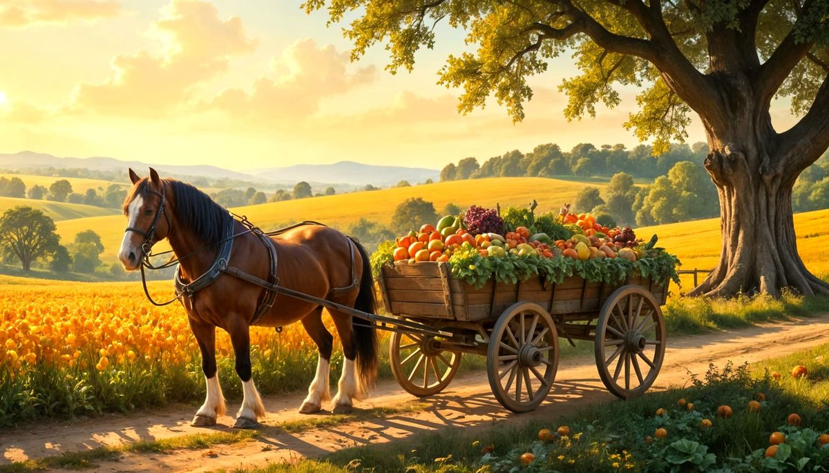This painterly realism image shows a majestic Clydesdale horse pulling a cart full of vibrant fruits and vegetables through a sun-drenched landscape. The scene features soft, cinematic lighting and an art nouveau flair.