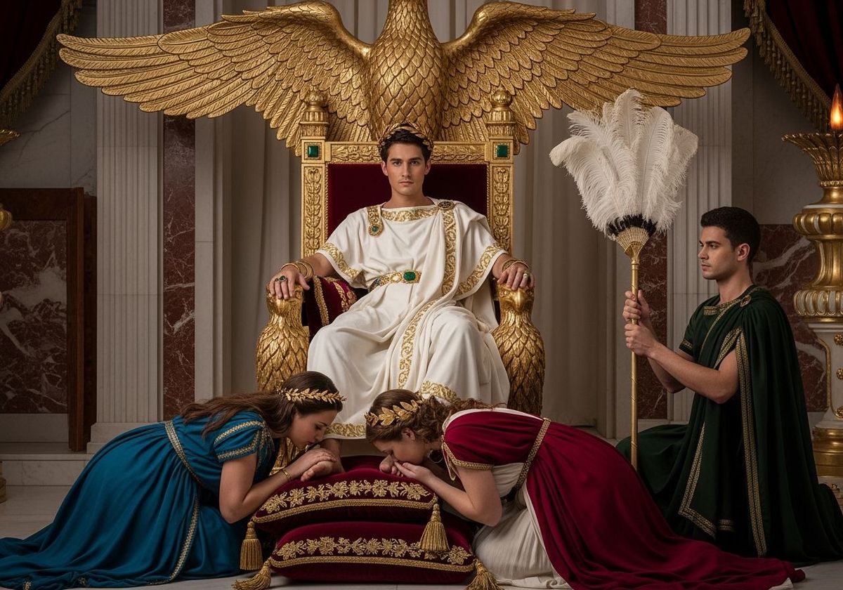 This image depicts a young Roman emperor relaxing on an opulent throne within his private palace. Servants attend to him in the lavishly decorated room, captured with sharp focus and natural lighting.
