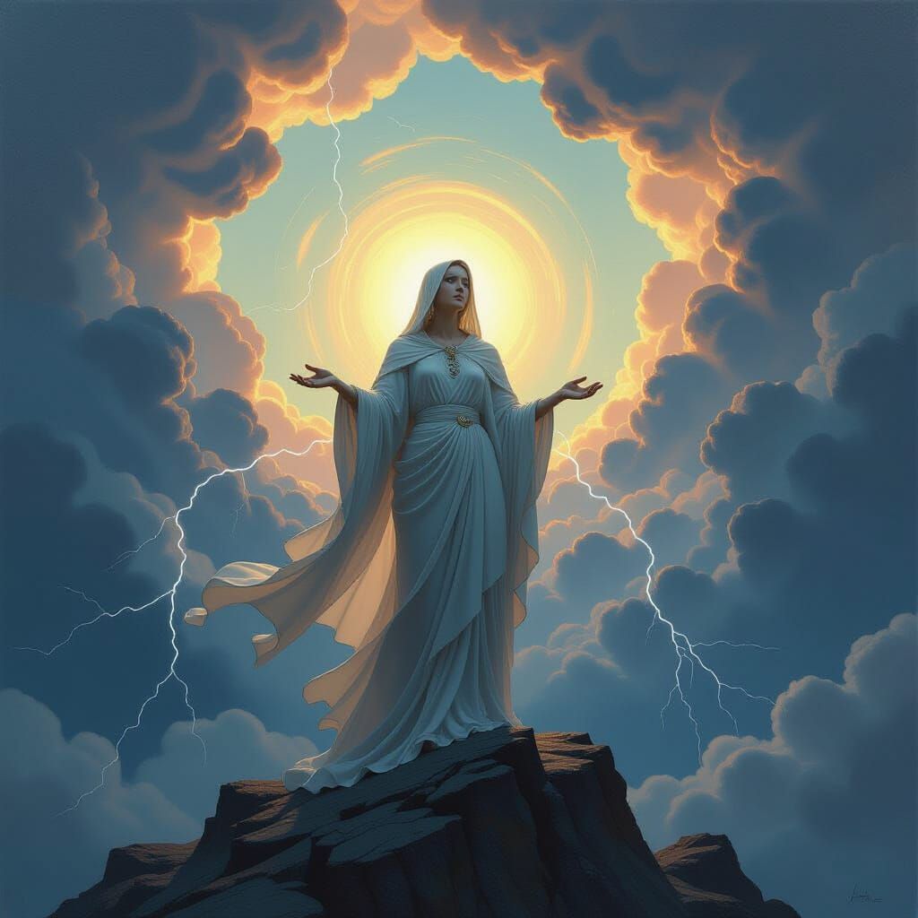 This image shows a serene matriarch wreathed in light, commanding a dynamic storm with lightning and rain. Rendered as an epic oil painting with high-contrast lighting and rich colors.