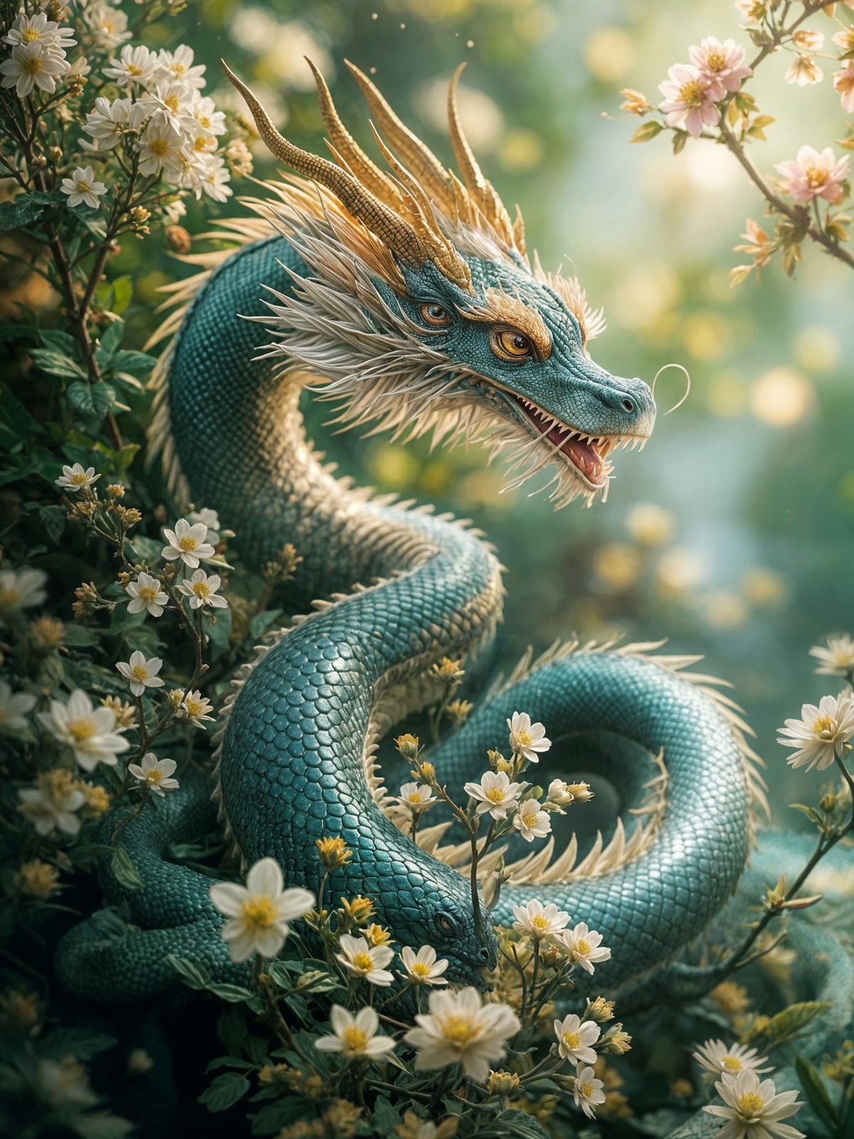 A striking picture of a long, serpentine Chinese dragon coiled among vibrant flowers. This detailed image captures the mythical creature in a traditional aesthetic, with shallow depth of field and a cinematic feel.