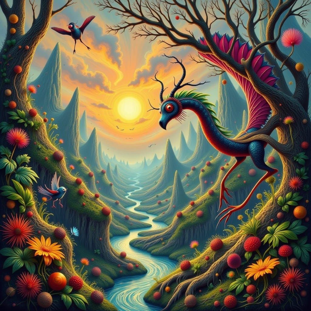 This image shows a lush Indonesian tropical scene with mythical creatures, painted in the style of the Hudson River School with dramatic lighting and vibrant colors.