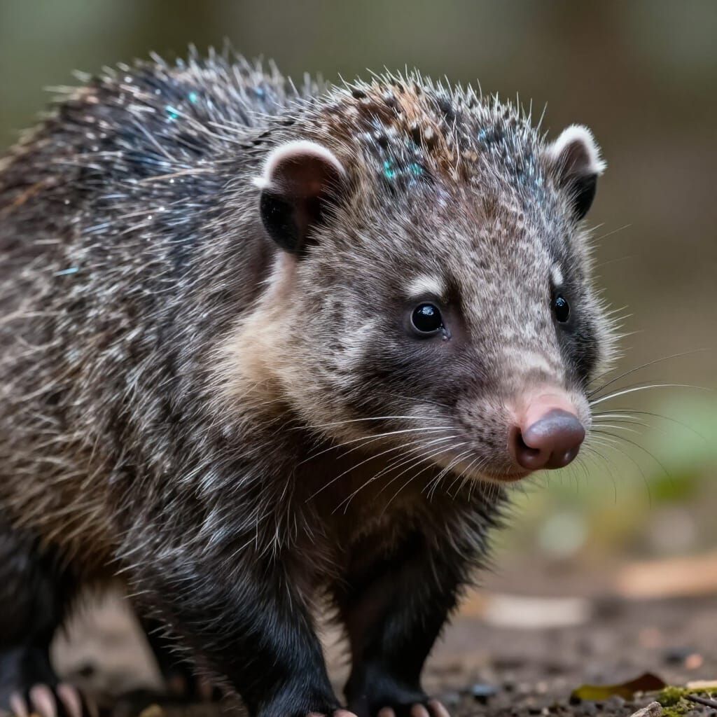 This image shows a hyperrealistic opossum captured in stunning 3D detail, highlighting its lifelike fur and iridescent highlights with cinematic lighting.
