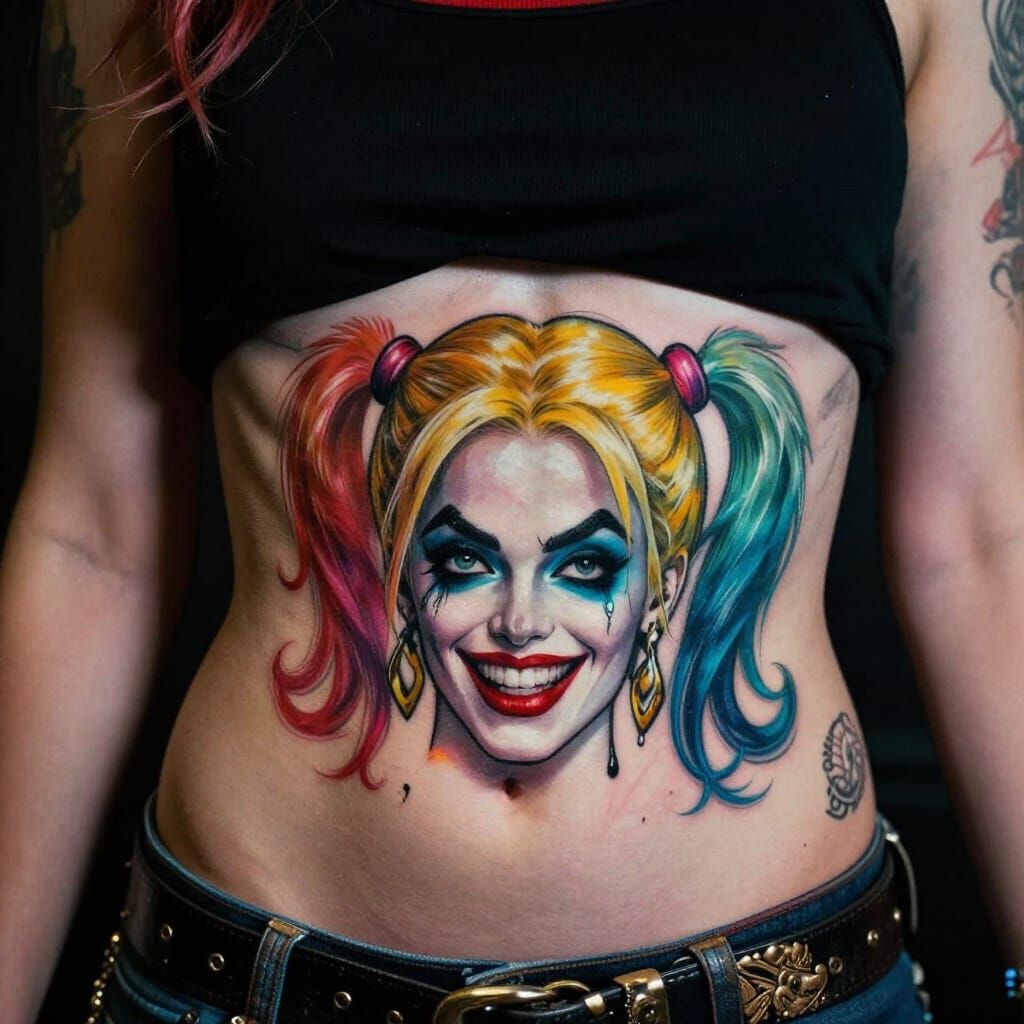 A detailed and vibrant tattoo of Harley Quinn's head on a woman's stomach, captured in a dramatic, cinematic style with realistic film grain and lighting.