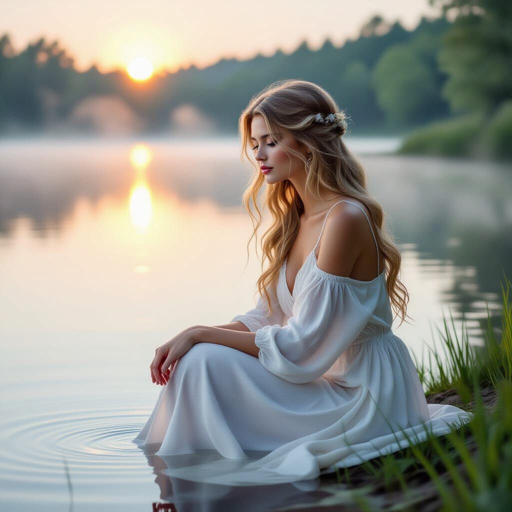 A serene woman in a white dress sits by a still lake at sunrise. Soft pastel colors and volumetric lighting create an ethereal glow in this romantic oil painting.