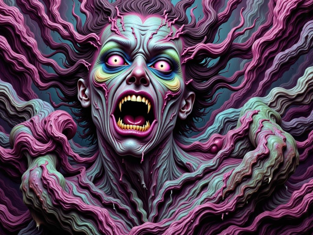 This image depicts a figure contorted in extreme pain, surrounded by a surreal landscape. Rendered in a visionary art style with grotesque forms and chilling lighting.