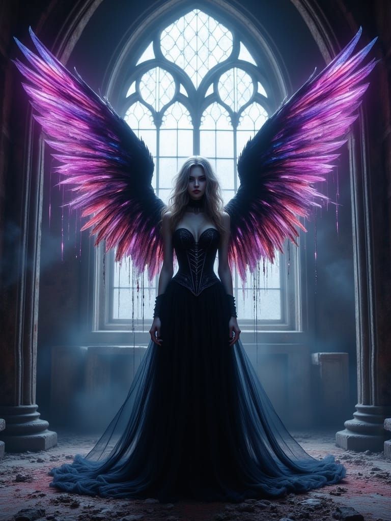 A striking picture of a gothic angel in a ruined chapel. The angel's wings glow with vibrant colors, casting light patterns in the fog, in a surreal gothic fantasy style.