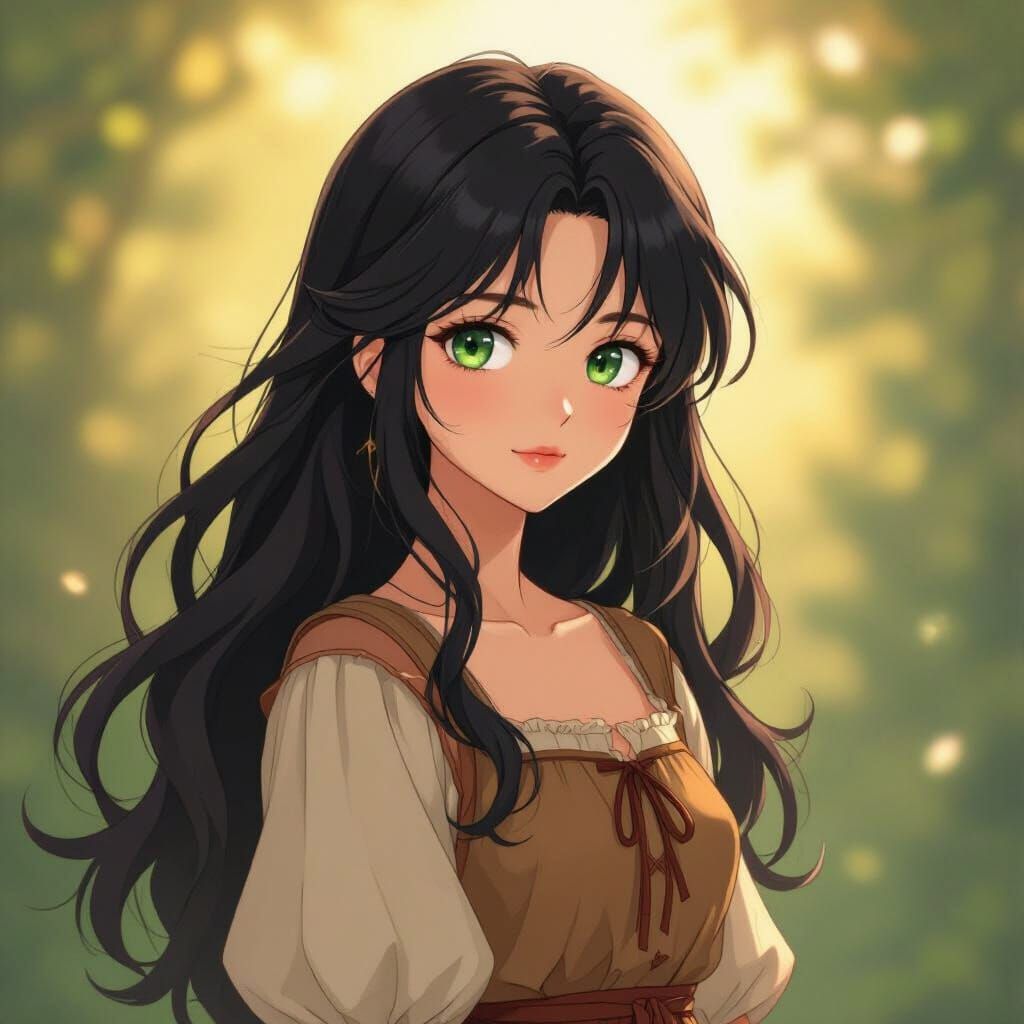 Generate unique anime girl images with black wavy hair and mediaeval dresses using our free AI tool. Easy and fast!