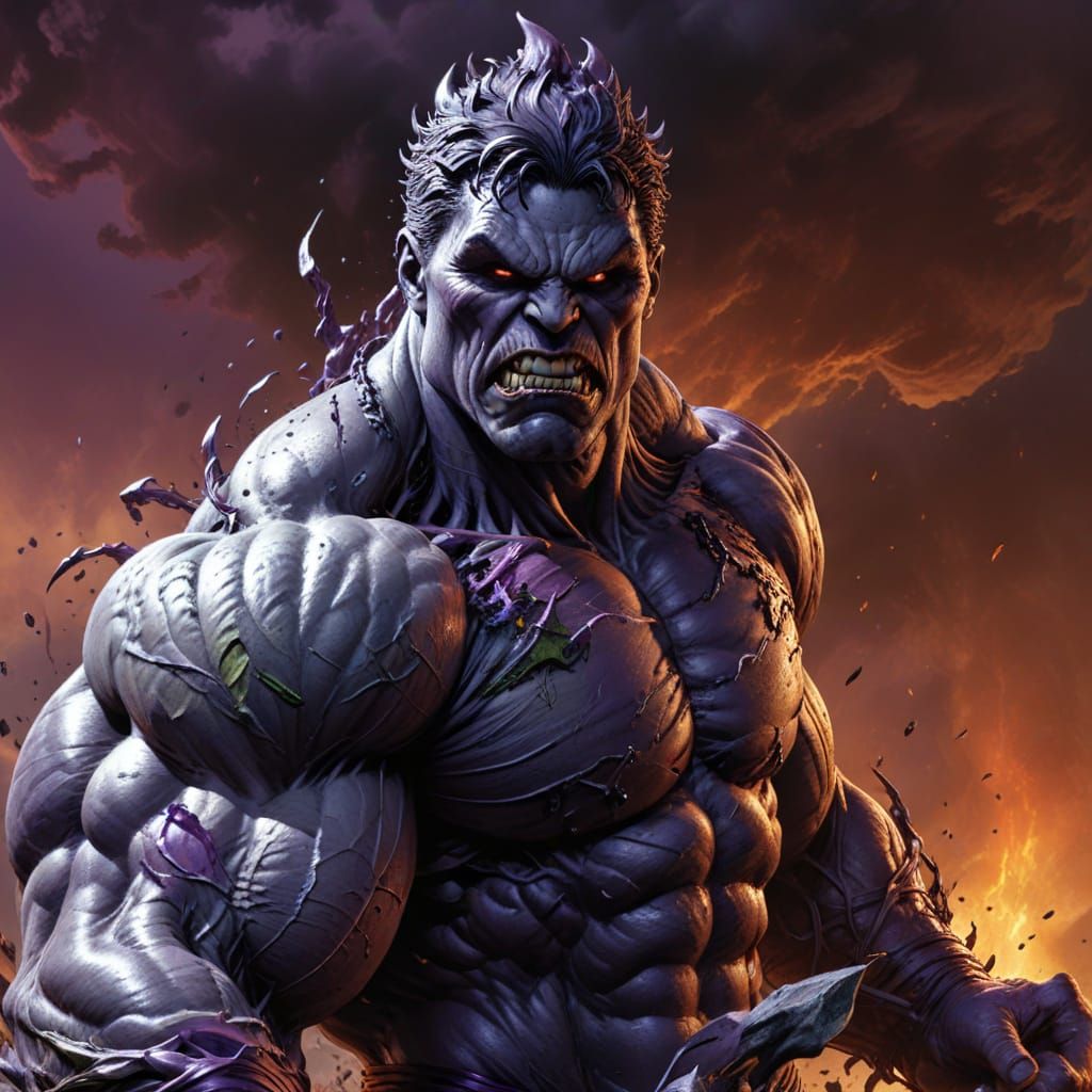 This image depicts a towering DC comic book villain, Doomsday, with dark, rich, plum-purple skin, and rippling muscles, as he prepares to unleash destruction, in a style reminiscent of comic book art.