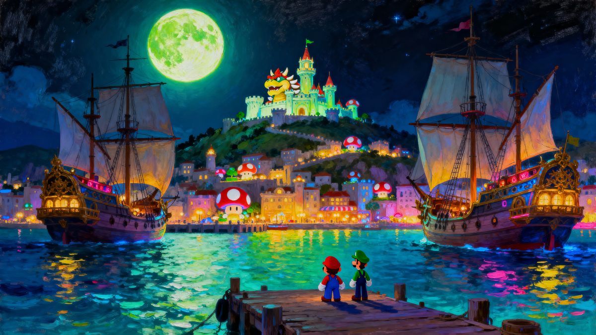This image depicts a vibrant fantasy harbor city at night, rendered as an oil painting. A grand castle overlooks the scene, with pirate ships docked below a luminous moon.
