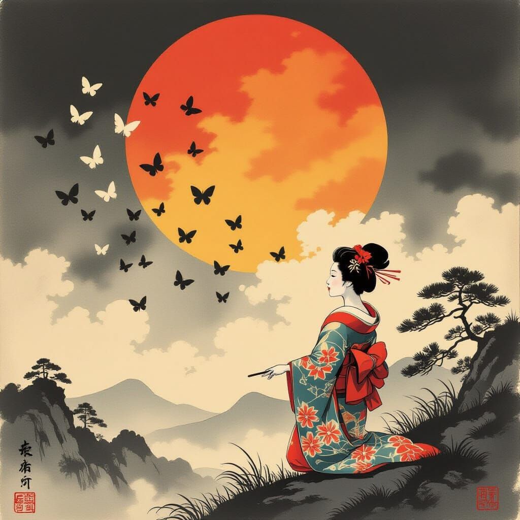 This image shows butterflies dancing in the sunlight, rendered in an Ukiyo-e style. The artwork captures Japanese aesthetic beauty, presenting a scene of serene perfection.