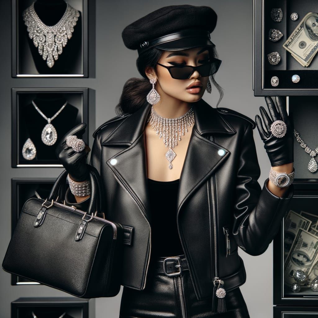 This image shows a daring young woman stealing diamonds and cash. She is dressed in black leather and stylish accessories as she loots an opulent jewelry store, filling her purse with valuables.