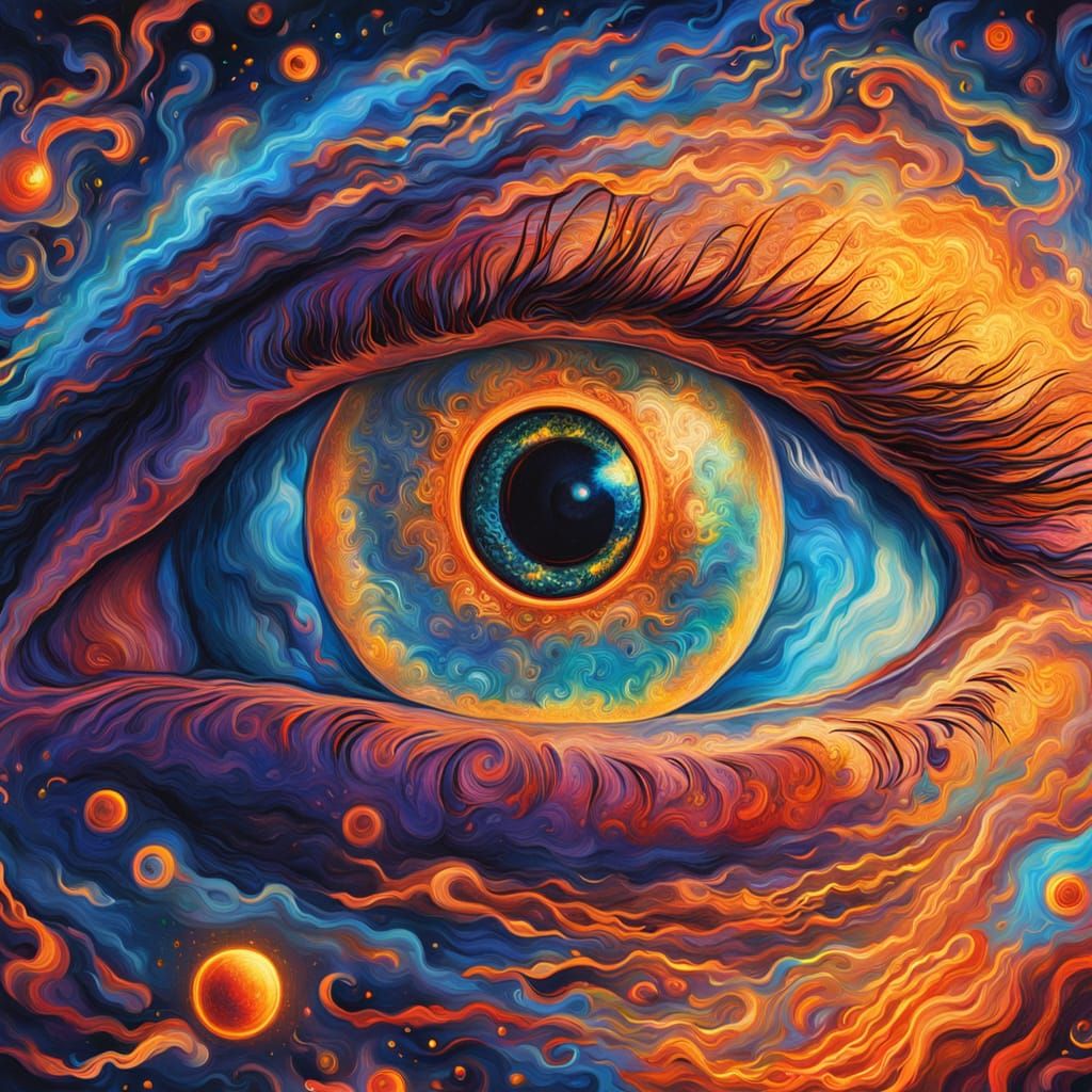 A close-up, vibrant illustration of eyes burning with inner fire, set against swirling astral clouds with golden and neon accents. Highly detailed and dreamlike.