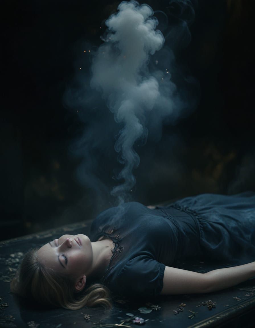 This image shows a Scandinavian woman lying serenely on a metallic table adorned with flowers. Ethereal smoke surrounds her in this hyper-realistic digital artwork, bathed in soft, golden light and pastel colors.
