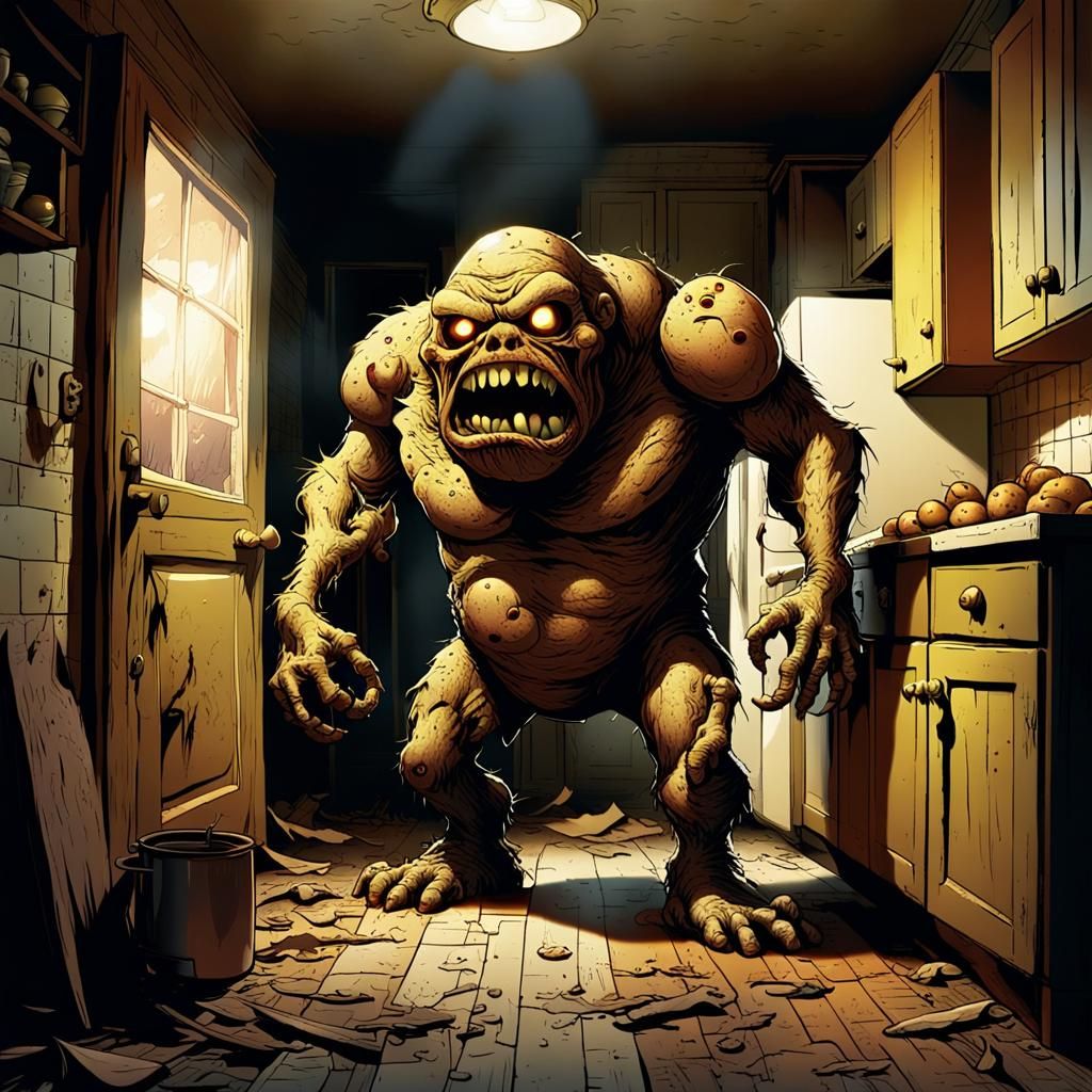 A comic book style illustration of a grotesque potato monster in a dilapidated kitchen. The image features dynamic lighting, eerie shadows, and dark, muted colors, creating a macabre yet humorous scene.