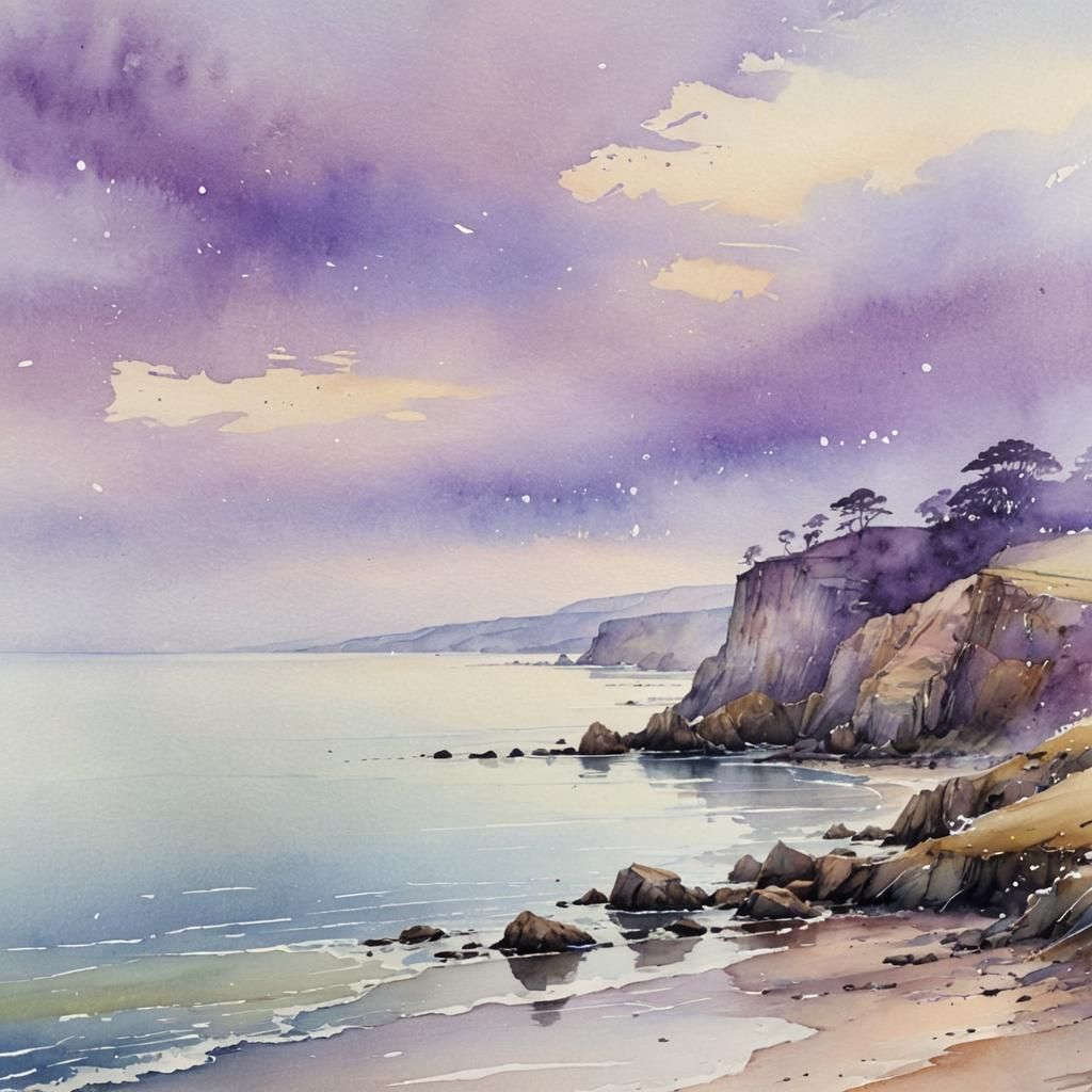 Dreamy antique watercolor landscape. A calm sea meets the sky at the horizon, with misty landscape. Soft focus. Ethereal, misty atmospheric perspective with faded purple hues, Carne Griffiths and Paula Hoppe styles. Gentle blends, soft brushstrokes, subtle texture, softer edges. Morning gentle light ...