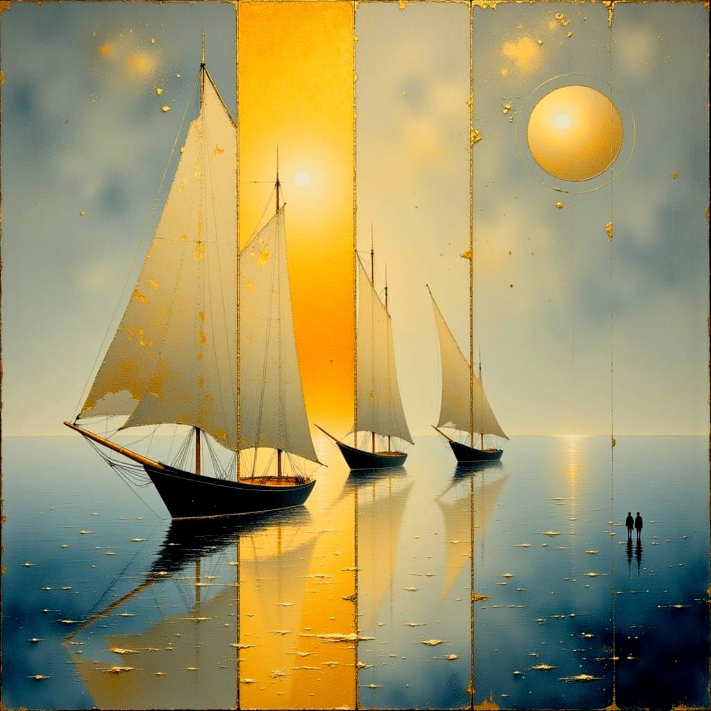 A surrealist oil on canvas painting featuring tall sailing ships with sails dissolving into golden fragments, set against a reflective surface and a misty seascape. Inspired by Dalí and Magritte.