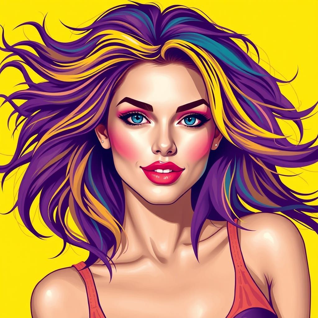 A captivating portrait of a young woman, likely in her late teens or early twenties, with a Caucasian ethnicity. Her expression is alluring and confident, with lips slightly parted in a suggestive, yet gentle smile. Her gaze is directly forward, engaging the viewer. Her long, flowing hair, vibrantly ...