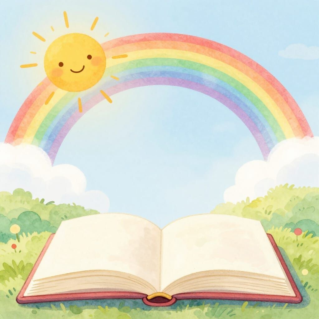 This image is a delightful children's book cover illustration. It features an open book, a smiling sun, and a rainbow, all rendered in a gentle watercolor style with soft shapes and a joyful atmosphere.
