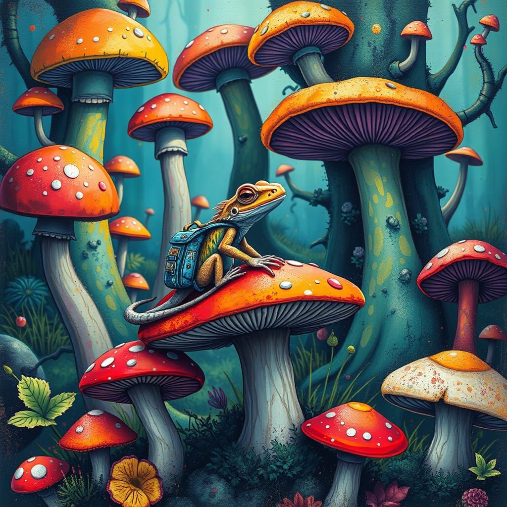 This vibrant image depicts tiny toadstools and towering fungi forests, each adorned with a small, intricately detailed lizard wearing a colorful backpack, set against a high-contrast, ultra-detailed graffiti art background with a polychromatic color palette.