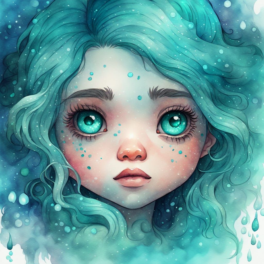 This image shows a chibi mermaid swimming through a storm. The mermaid has turquoise hair, scales, and eyes. The image is a watercolor painting with soft lighting and brilliant colors.