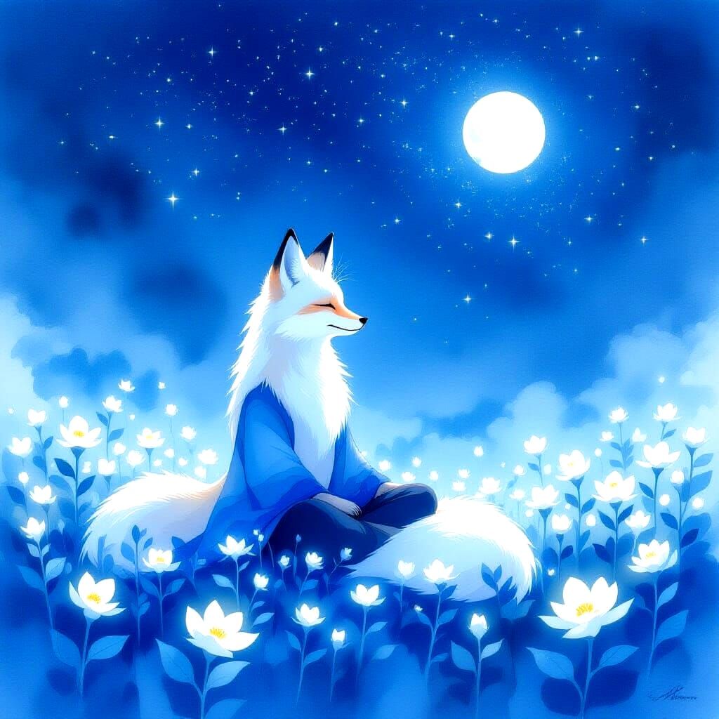 Inner Peace theme. Watercolor. A serene, ethereal fox spirit (kitsune) meditating peacefully amidst a field of glowing moonflowers under a s...
