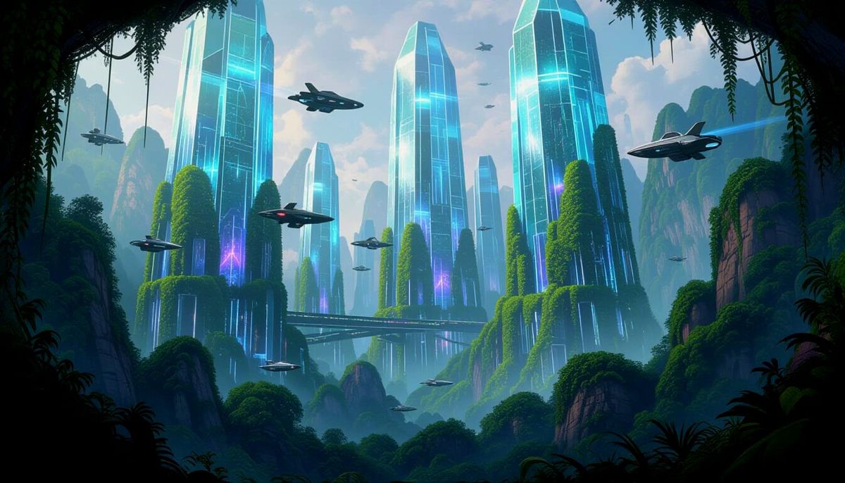 This image shows a sprawling alien city nestled in a jungle. Crystalline towers are overgrown with vines, and flying vehicles navigate the canopy in this science fiction concept art.