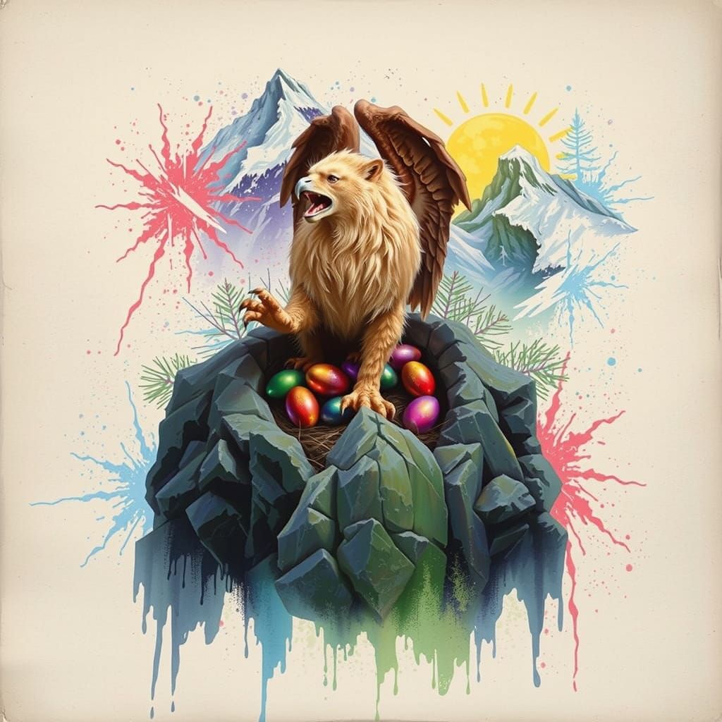This image depicts a powerful griffin, with lion's body and eagle's head and wings, guarding a hidden nest of shimmering eggs on a rugged mountain peak. Rendered in photorealistic style with dramatic lighting and vivid colors, evoking a sense of epic fantasy and wilderness.