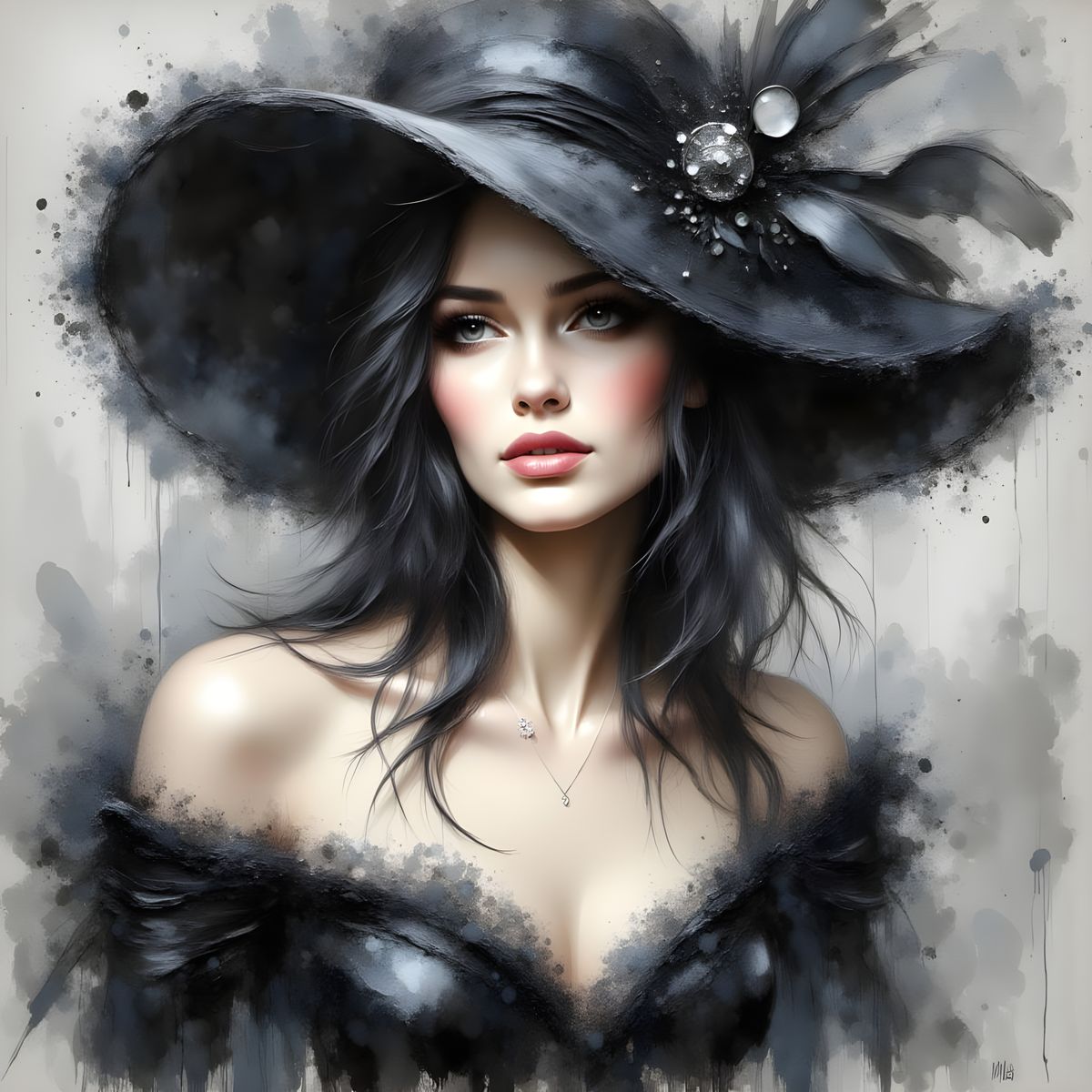This image showcases a glamorous woman in a grey dress and hat, rendered in a vibrant, textured impasto oil painting style with dramatic shadows and luminous highlights.