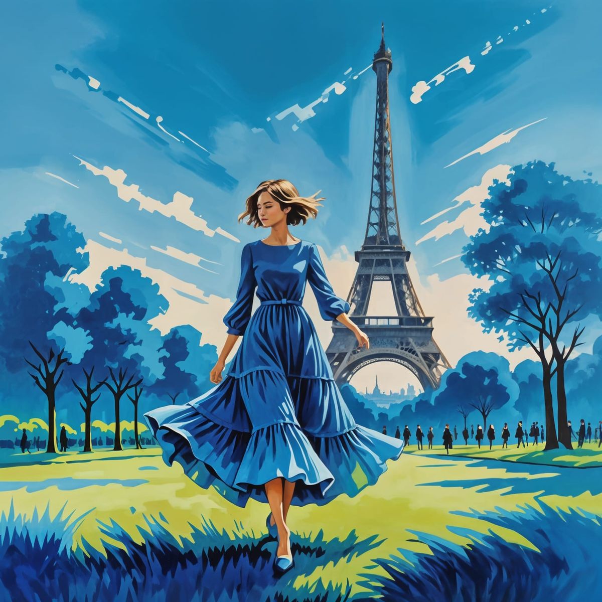 A monochromatic fauvist acrylic painting of a woman in a blue dress with the Eiffel Tower in the background. This single-color artwork captures a Parisian scene in the style of Signorini.