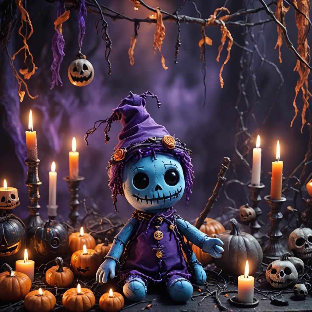 A close-up of a voodoo doll on a Halloween altar, rendered as digital art. The scene is lit with vibrant colors, shadows, and flickering candles in a warm, mysterious color scheme. Eerie and dreamlike.