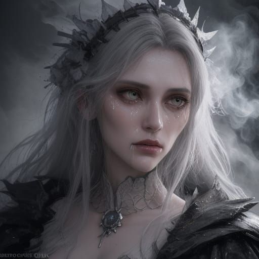 This image shows a haunting close-up of a ghost girl's face, with tears of liquid gold streaming down her cheeks. Her diamond eyes and jagged teeth are set against a dark, atmospheric background of wispy smoke and ethereal glow.