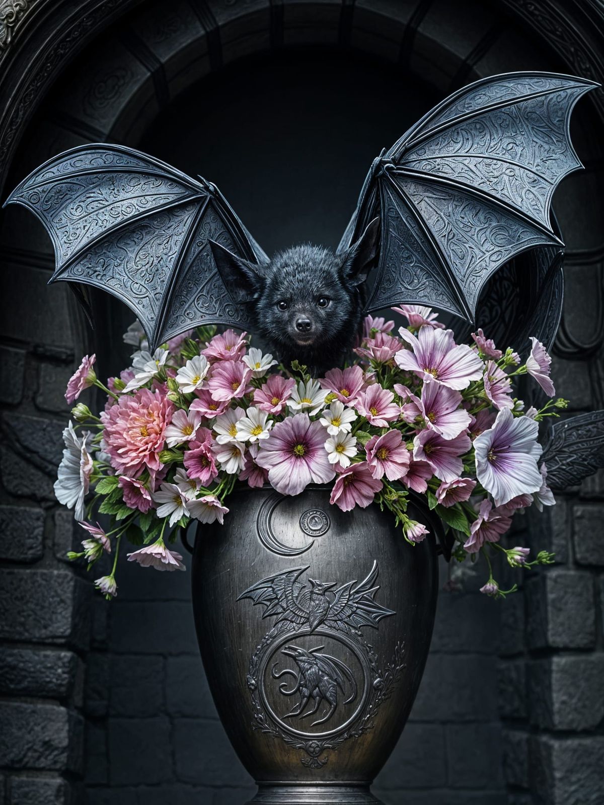 This image shows a black bat perched on a tarnished silver urn decorated with a wolf. The urn overflows with pink, white, and lavender flowers, set against a dark stone chamber backdrop.