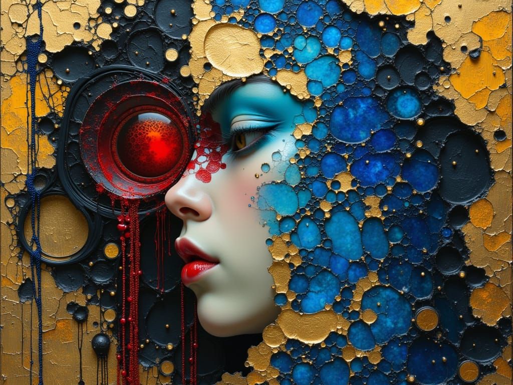 This image shows an old wizard adorned with cinnabar and lapis lazuli, depicted with chains, in a vibrant, high-resolution Art Nouveau style with dark oil paint textures. The scene uses dramatic lighting and expressive brushstrokes.