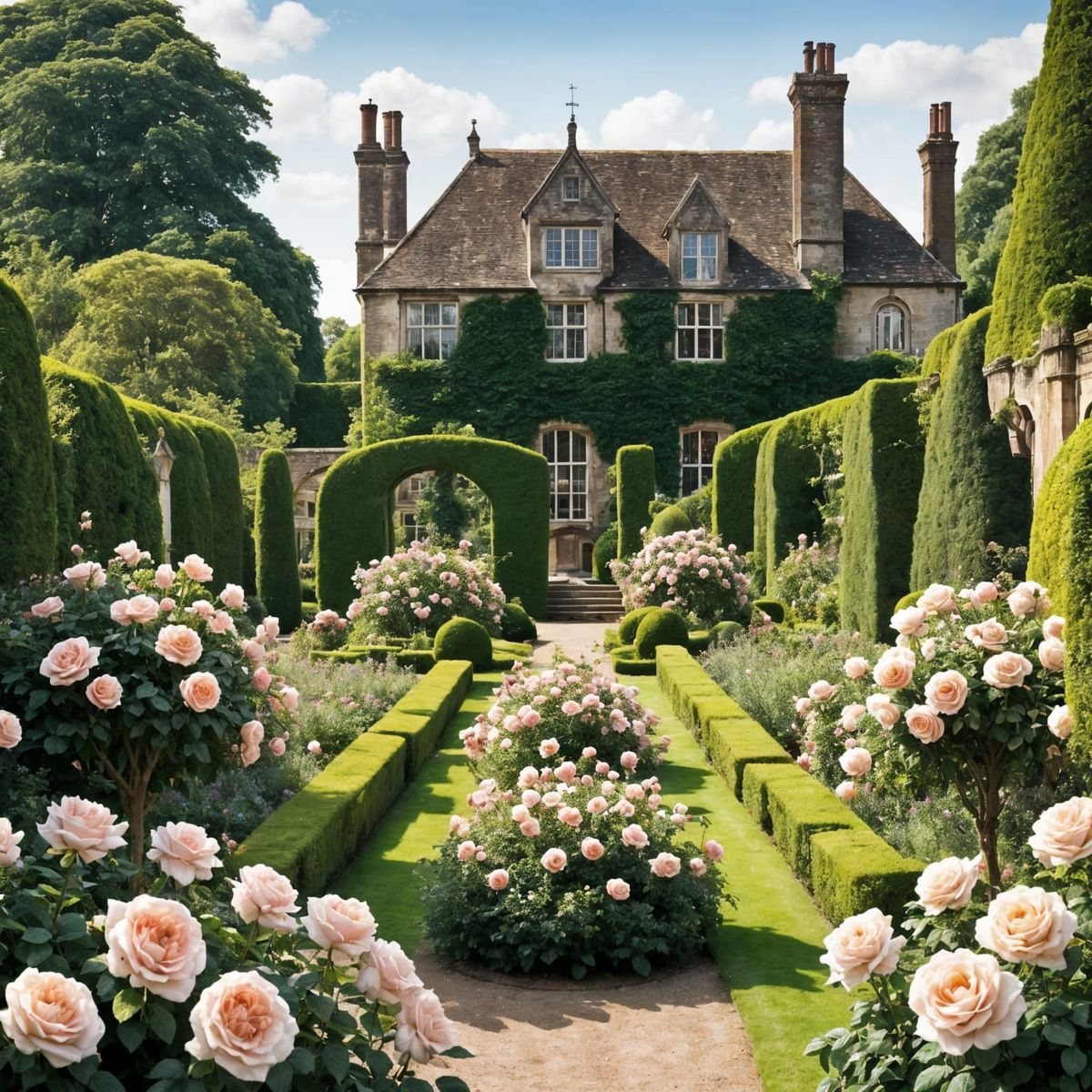 A beautiful, hyperdetailed rose garden in the old English style with pastel roses, topiary, and an English manor house. The image features a shallow depth of field.
