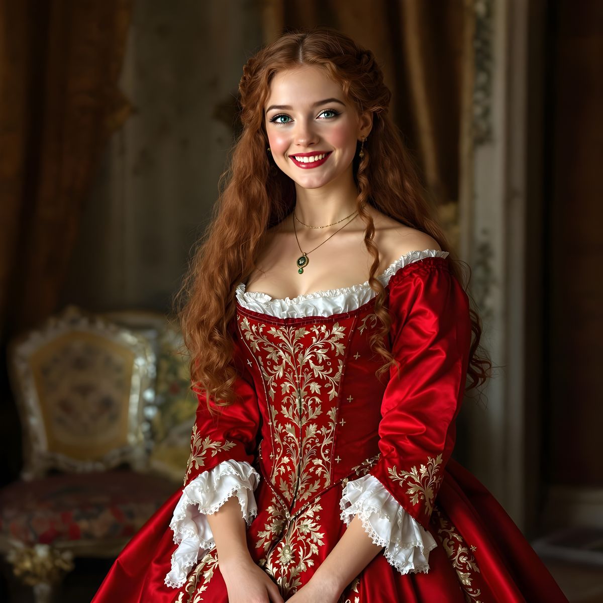 This image depicts a smiling seventeen-year-old girl in an 18th-century setting. She has long reddish-brown hair, mint green eyes, and wears a ruby red gown with gold embroidery and white lace.