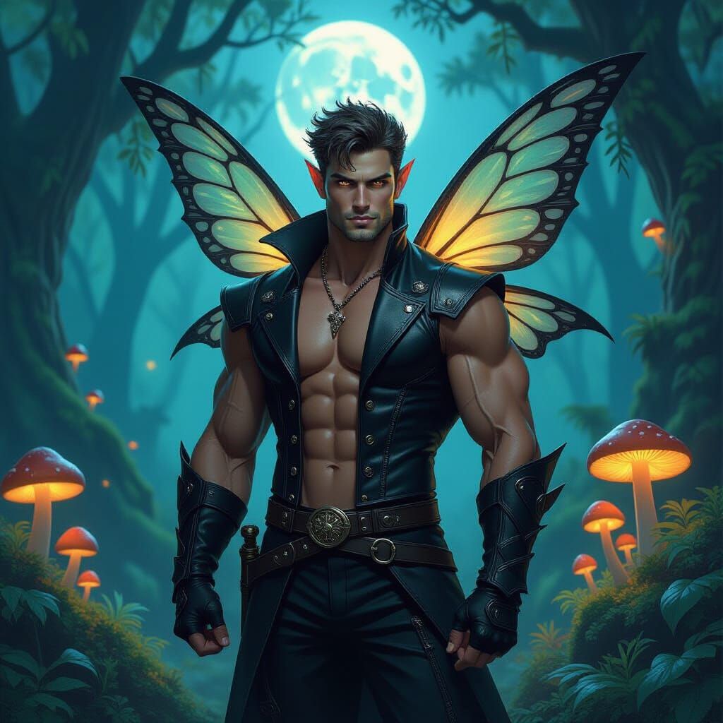 This image depicts a powerfully built male fairy in a dark leather outfit, standing in an enchanted forest clearing under moonlight. Features dramatic lighting and vivid colors in a dark fantasy illustration style.